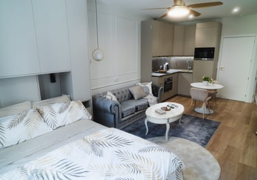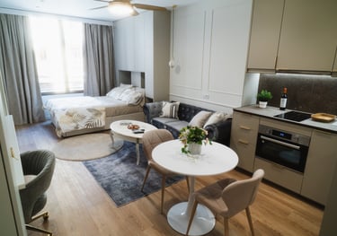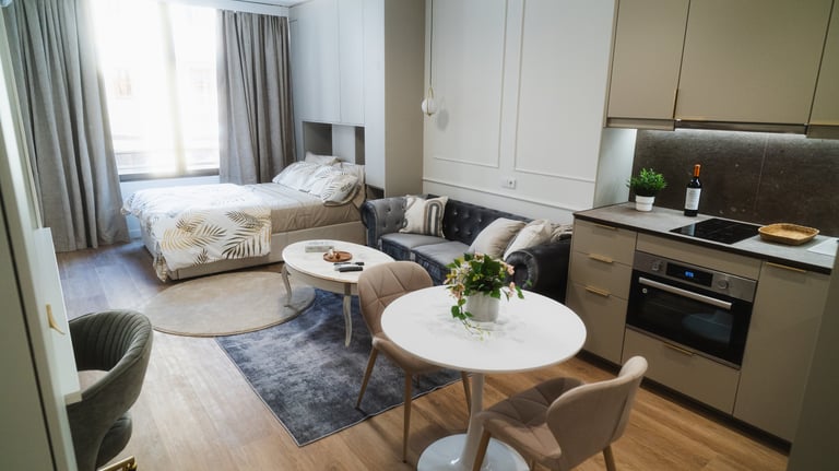 A cozy yet luxurious studio with chic decor, blending the elegance of the golden era with a modern touch.